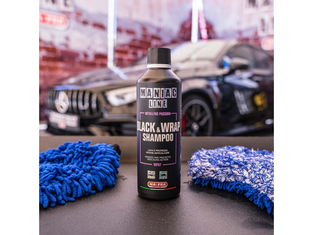 MANIAC Šampon na černý nebo foliovaný povrch je vysoce koncentrovaný čisticí přípravek určený k ochraně a údržbě tmavých a matných laků nebo vozidel s ochrannými PPF fóliemi a foliemi instalovanými za účelem změny vzhledu nebo barvy auta. Jeho složení s minerálními sekvestranty zabraňuje vzniku skvrn od vodního kamene během sušení, což je častý problém u tmavých laků. Pravidelným používáním šampon odstraňuje šedou patinu, zajišťuje vysoký lesk a oživuje původní barvu povrchu. S jeho vysokou lubrikační schopností minimalizuje riziko vzniku kruhových škrábanců (tzv hologramů) a zachovává povrchový finiš bez poškození. Navíc je zcela bezpečný pro použití na keramických povlacích a jiných ochranných vrstvách, které jsou často na PPF fólie aplikovány.