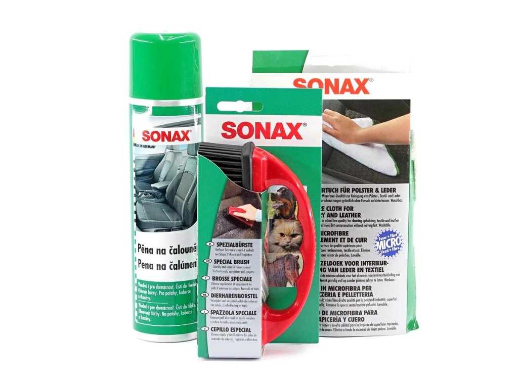 Sada je vhodným dárkem pro majitele vozu s textilním čalouněním. Každý, kdo v autě vozí psa, kočku, nebo jiného chlupatého mazlíčka, ocení kartáč na chlupy. Kartáč snadno a rychle zbaví čalounění psích nebo jiných zvířecích chlupů. S pomocí pěny a utěrky na čalounění bez problémů odstraníte špínu a nečistoty ze sedaček, koberečků a textilního čalounění.